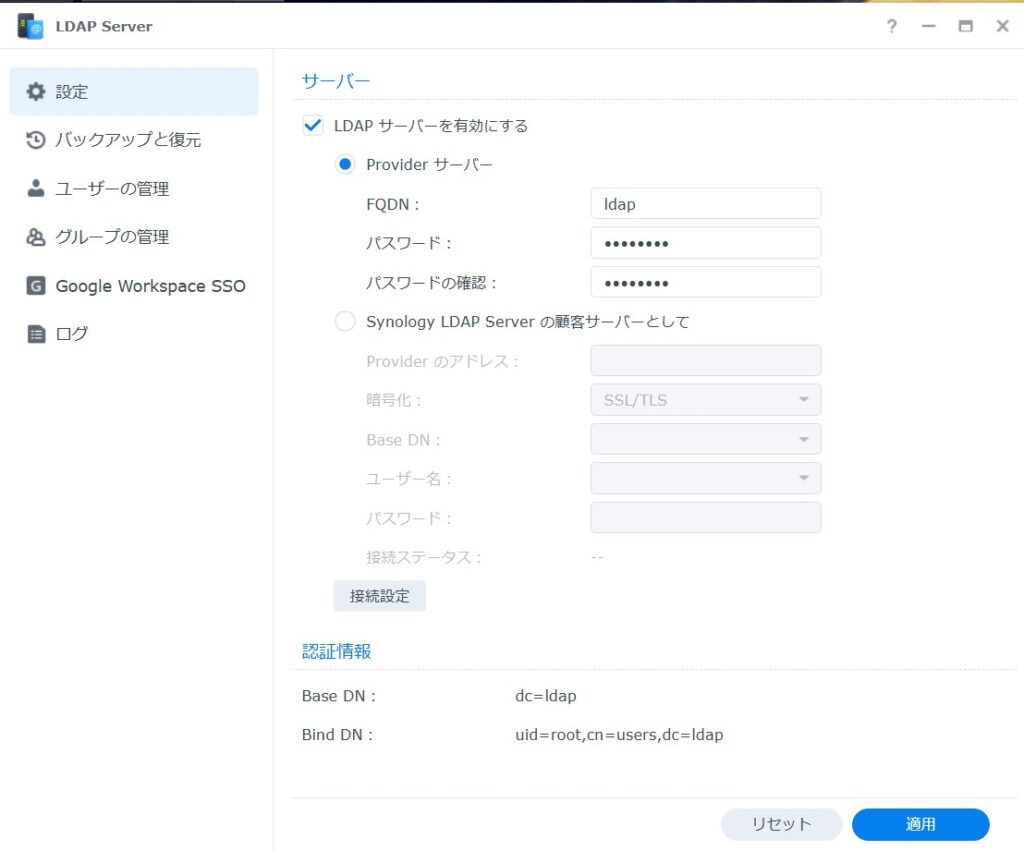 SynologyのLDAP Server設定で、Providerサーバーと顧客サーバーという選択ができる。