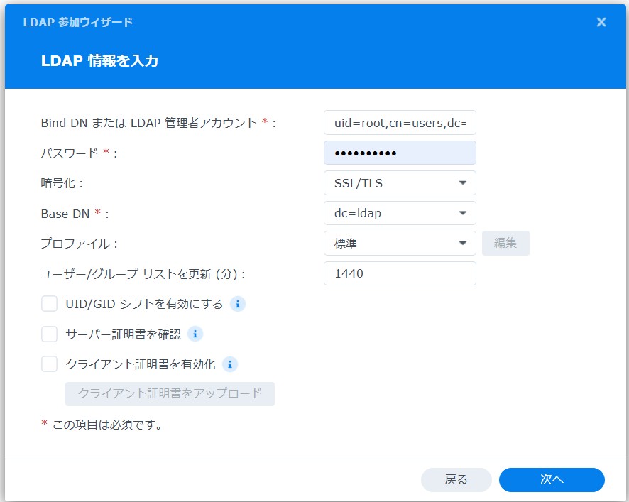 コントロールパネルの「ドメイン/LDAP」から、「参加」を選択し、LDAPに参加する。