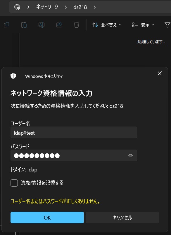 DS218の共有フォルダを開こうとADに参加している仕事用PC達からエクスプローラー経由でアクセスすると、資格情報の入力が求められるが、DS218の資格情報を入力すると、Windowsが勝手にドメインプレフィックスを付けてしまい、DS218へアクセスできなくなってしまう。