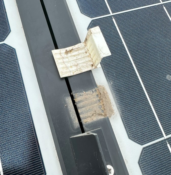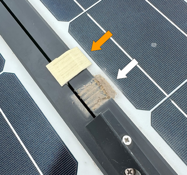 今年の5月にパネルに設置した水抜きパーツの状態を確認しました。元々白い矢印部分にありましたが、スライドさせてオレンジ矢印部分に移動させました。