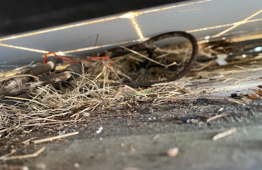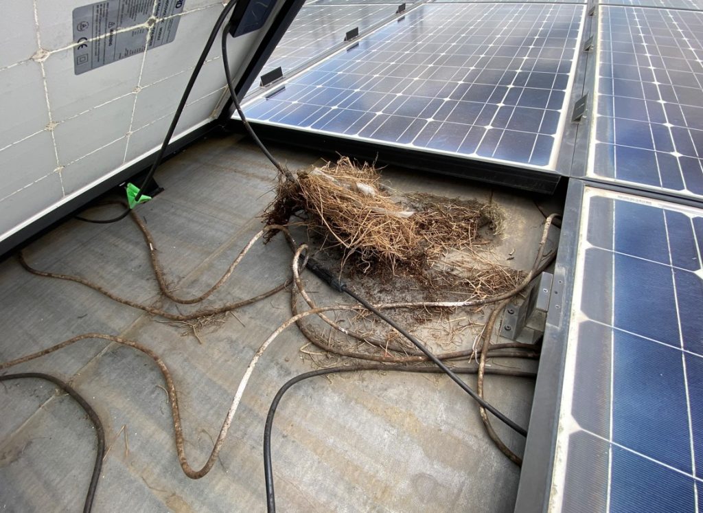 巣が雨で流れないように考えているのか、ケーブルが集まっているあたりを狙って巣を作るので、パネル自体も暑くなりますし火災が心配ですよね。