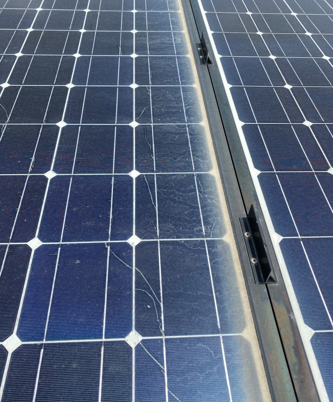 このパーツが無いとどうなるかと言うと、パネルの水下に土埃や黄砂が溜まってガラスが曇ってきてしまいます。すぐに大雨で流れれば問題無いのでしょうけれども・・・。