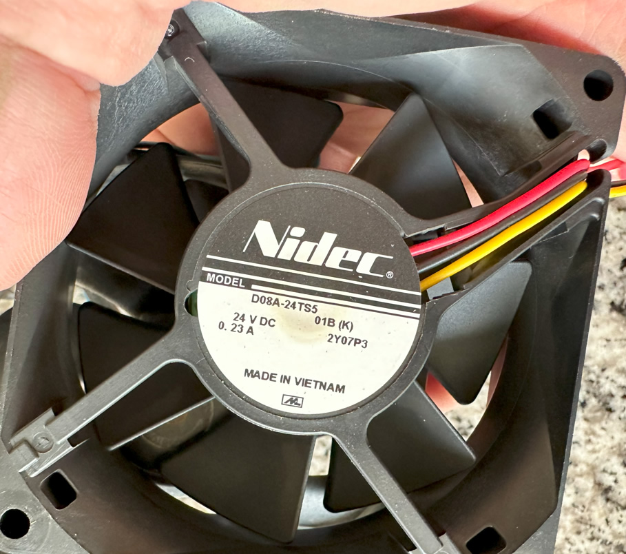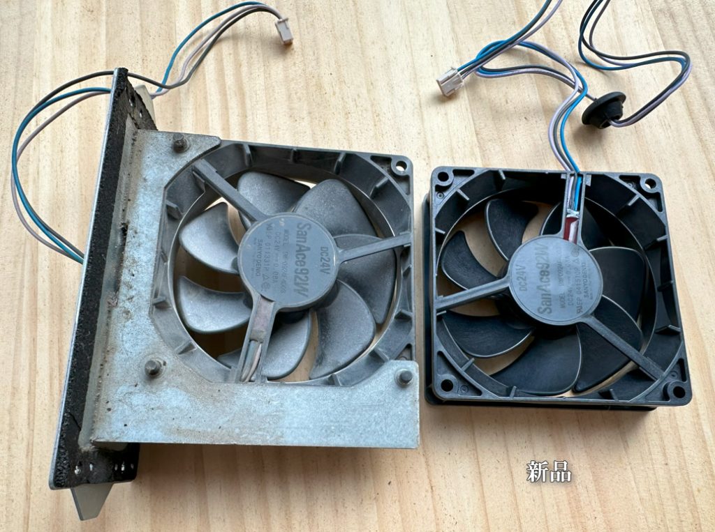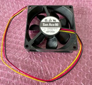一応8cmファンを2種類取り寄せてみたんですが、風量が近い左のファン(24v 0.2A)に交換する事にしました。設置場所を見る限り、放熱用途じゃなさそうなんですけどね・・・。5000rpmで回転していて、右のファン(24v 0.05A)はほぼ無音なのに対し、圧倒的にうるさいですが、ファンを触っていても振動は感じず、室内で聞いても壁に耳をつけてようやく聞こえるくらい静かになりました。