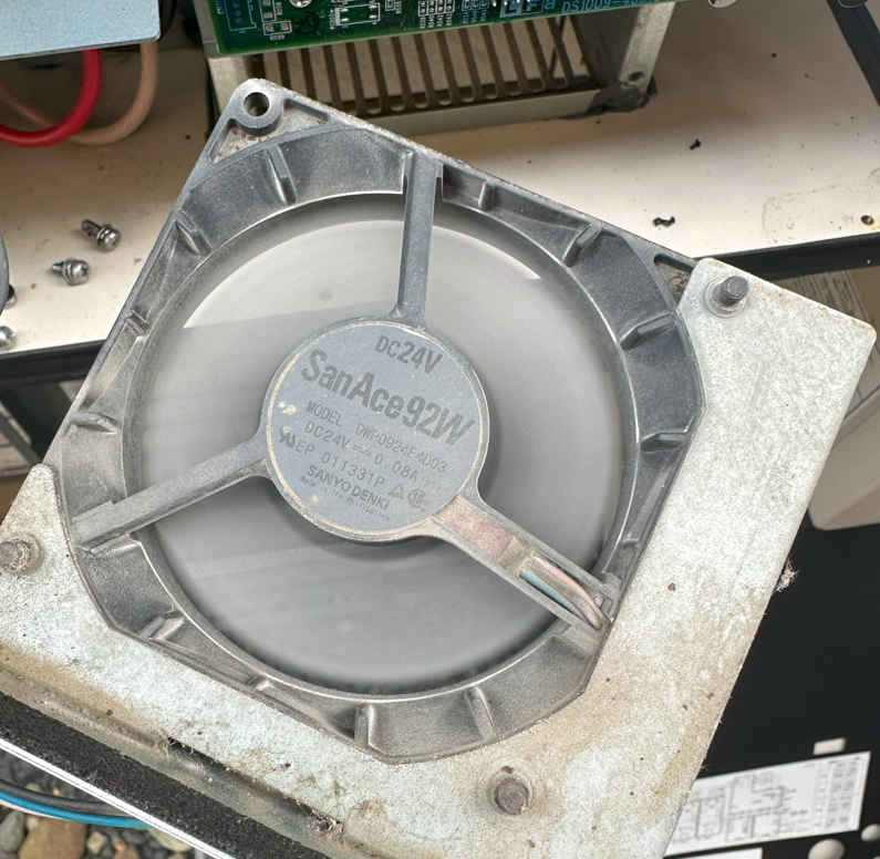 5.5kwの場合、吸気用ファンは9.2cmのこの1台で行っていて、前面パネルを開いた内部から手前方向に取り外します。