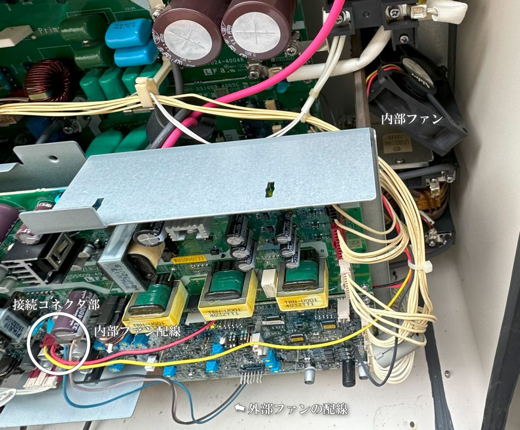 全てのファンはコネクタで基板接続されていたので、片方ずつコネクタを抜いて音を確認した所、5.5kw側パワコンの内部ファンを止めると静かになる事がわかりました。