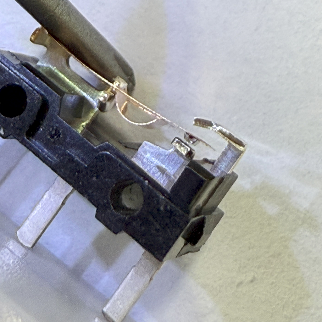 という作りなのですが、このちっこい端子が勢いよく下の端子に接触するとパチンと音がしてしまう様です。