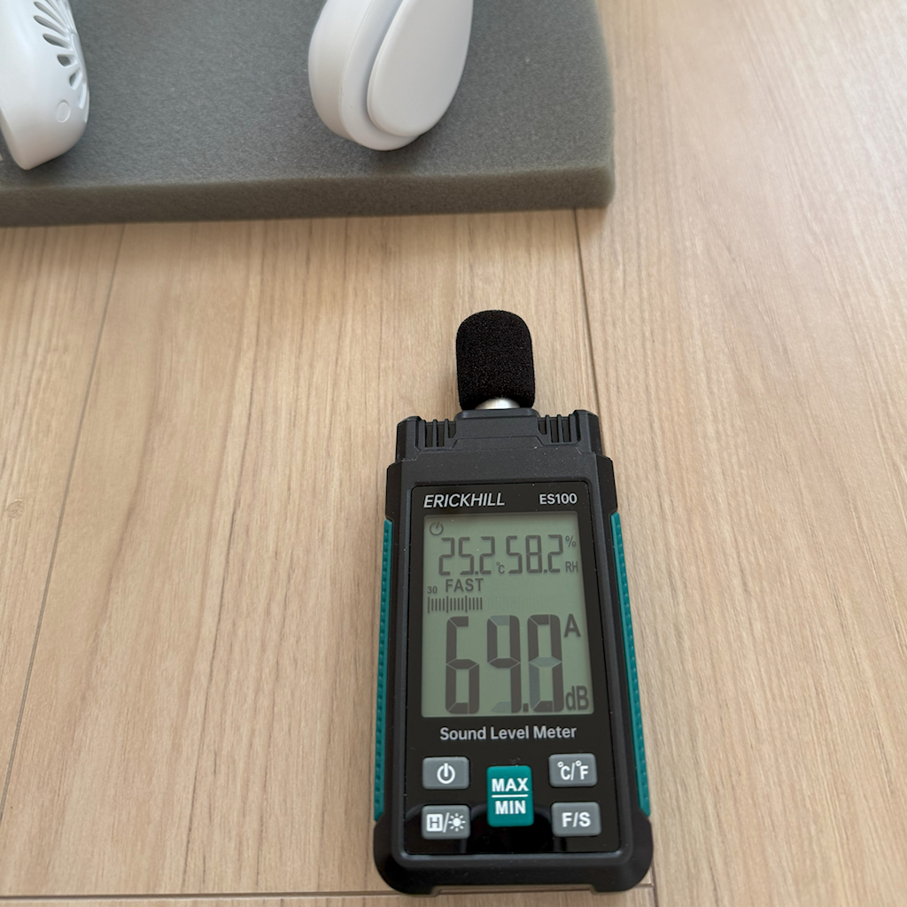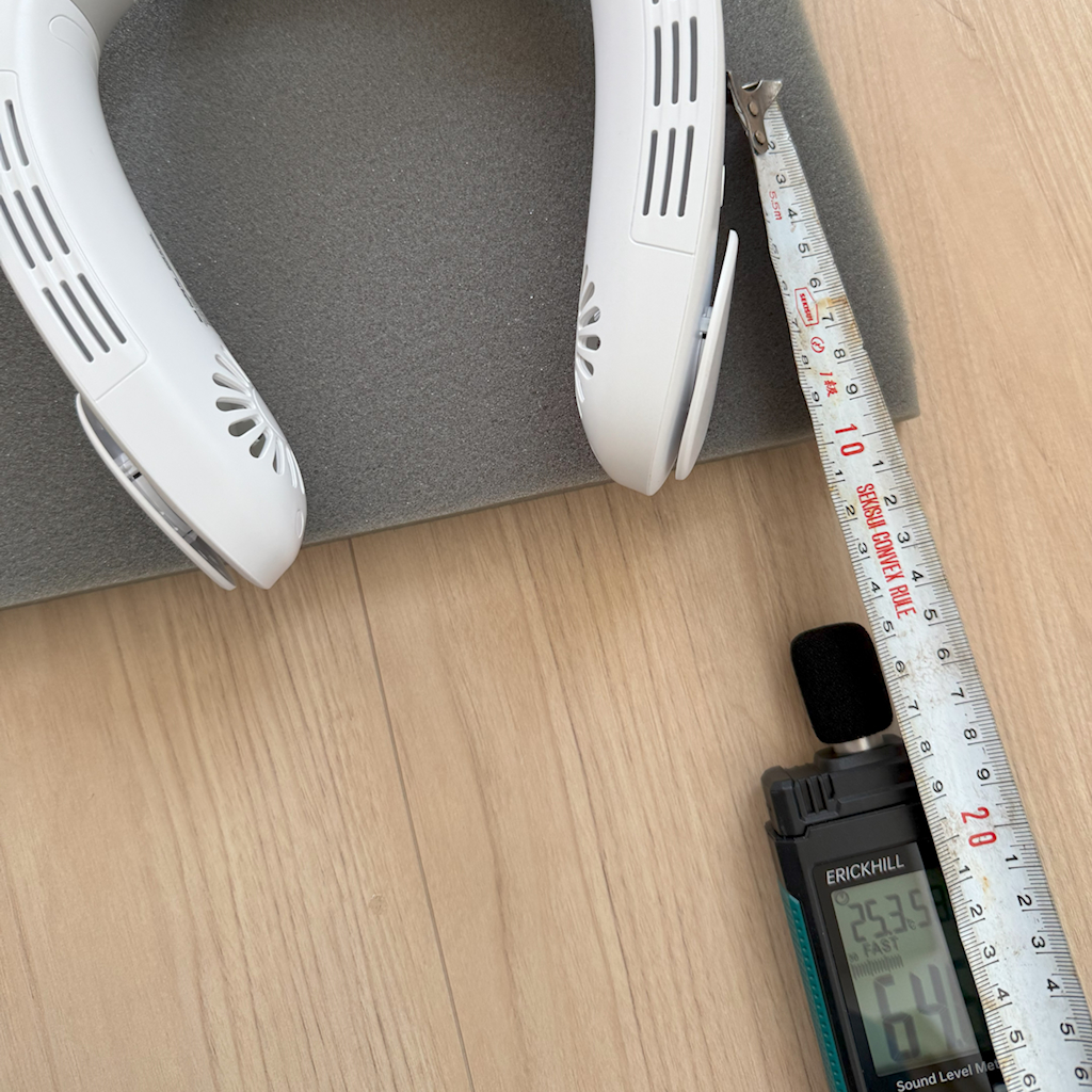 ネッククーラーを肩に乗せた状態で、耳までの距離が15cmくらいだったので、15cmの距離に騒音計を置いてモード1から3まで測ってみます。