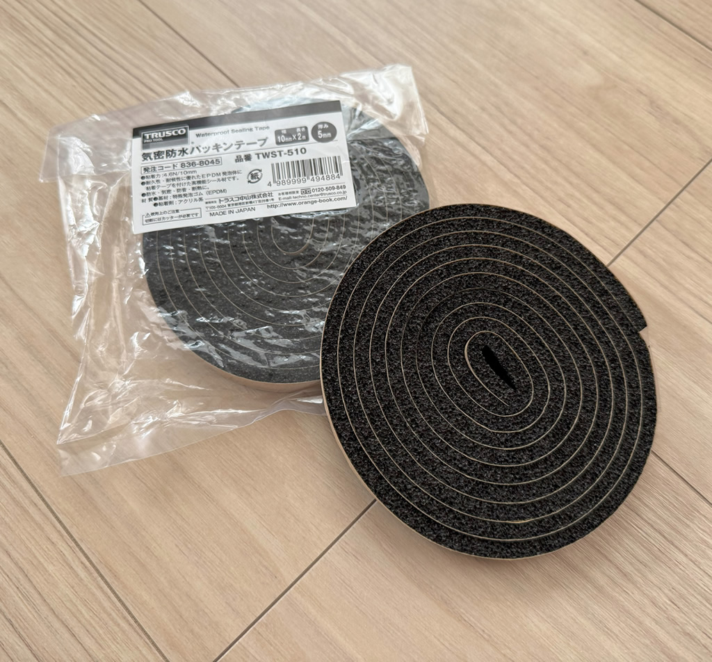 気密を確保するためのテープです。 TRUSCO 気密防水テープ TWST-510 167円(税込)・厚さ:5mm・幅:10mm・長さ:2m 厚さは5mm~20mmまで5mm刻みで設定があります。幅は1... -